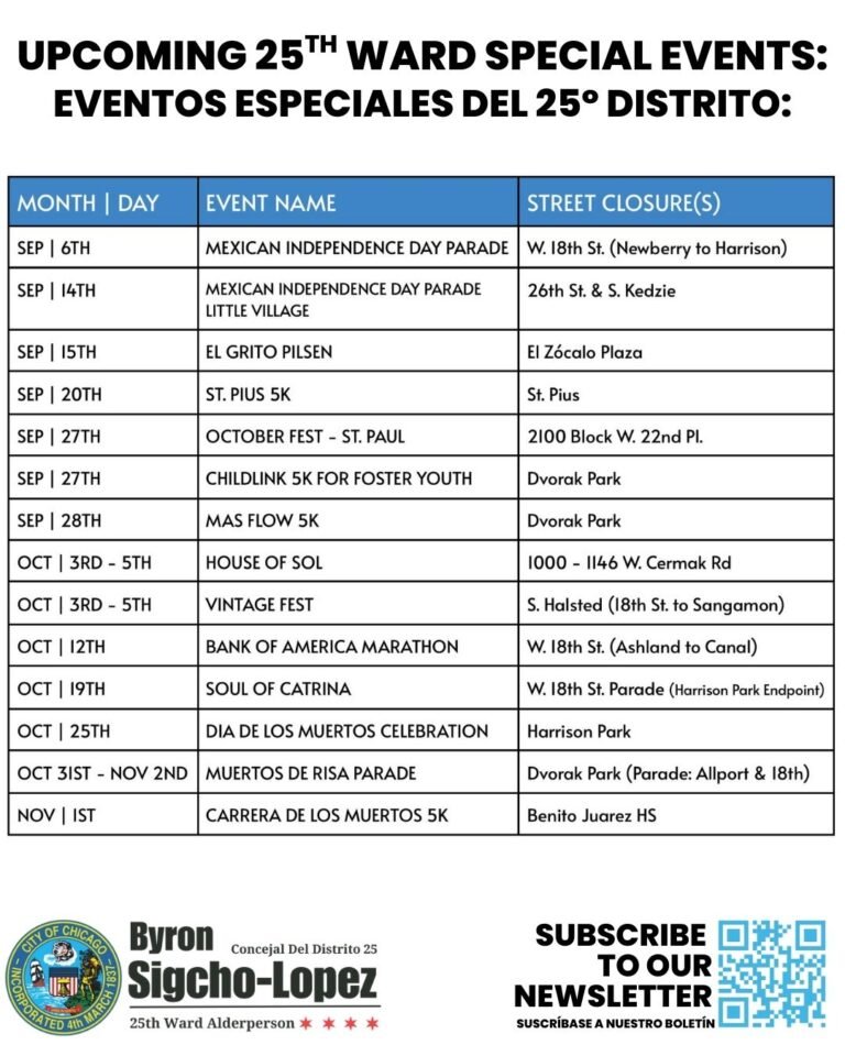 25th Ward Residents take a look at the list of special events happening in the ward that will have a street closure. If you have any questions, comments, or concerns, please contact our office.