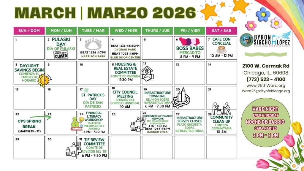 Don’t miss out on events in the 25th Ward! View all upcoming events and community meetings happening this month. You can also sync your Google Calendar with our scheduled events.