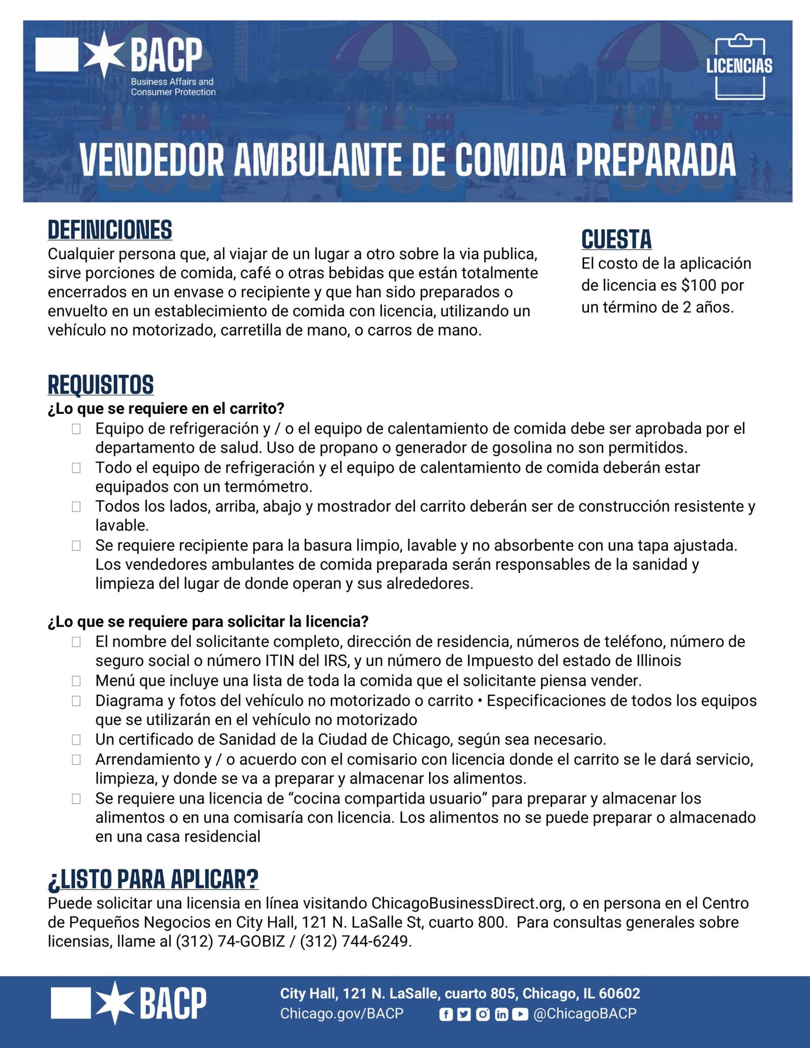 Un “Vendedor Ambulante de Alimentos Preparados ” es cualquier persona que, al viajar de un lugar a otro por la vía pública, sirve porciones de alimentos, café u otras bebidas que están totalmente envueltas en un envoltorio o recipiente y que han sido preparadas o envueltas en un establecimiento de alimentos autorizado, utilizando un vehículo con ruedas no motorizado, un carrito o una carretilla de mano.